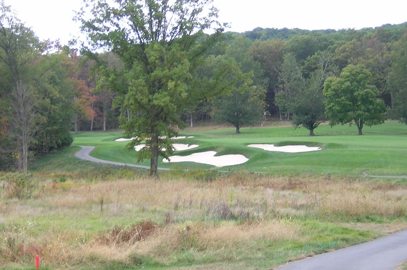 From an elevated tee box, the closing hole on the front nine is realistically the only reachable par five on the course at just 525 yards. A tributary of Shober's Run splits the fairway at the 340-yard mark, so reaching the water is doubtful. Two bunkers down the right side will certainly keep you honest.