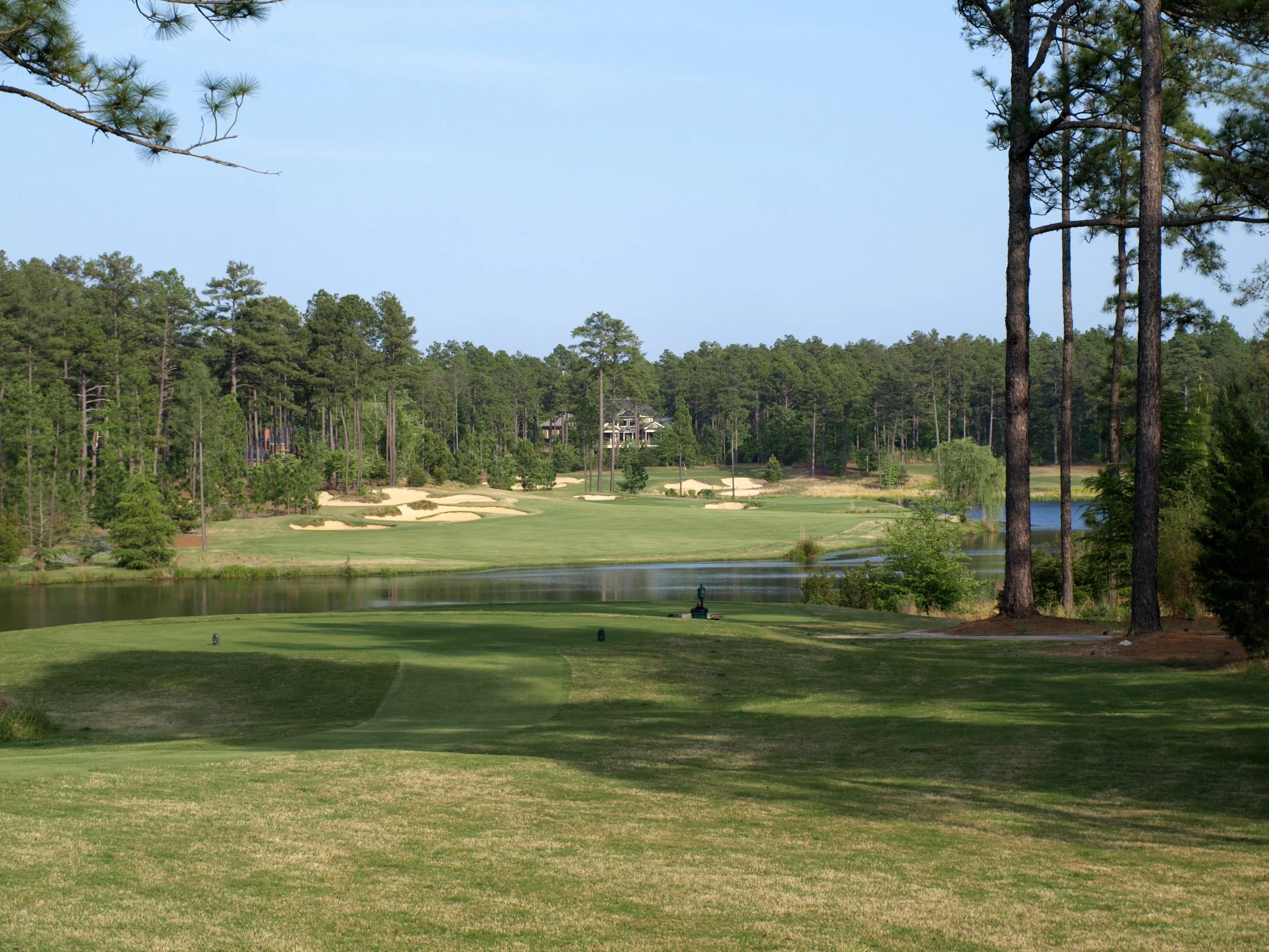 The closing stretch of four holes is as good as it gets in the Pinehurst region, starting with the eye-popping 15th. From the back markers, it's 432 yards, slightly downhill and over a lake. Hopefully, the wind will be at your back, otherwise, choose a different tee box. The water wraps around the entire right side, while several bunkers populate the left of the landing area. A short-to-mid iron should remain to a green fronted by a pot bunker. Miss long and you'll be left with an almost impossible up and down from an area well below the putting surface. The green is wide, but shallow, so choose the right club to approach.
