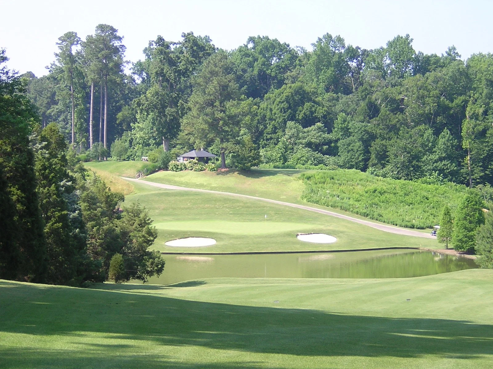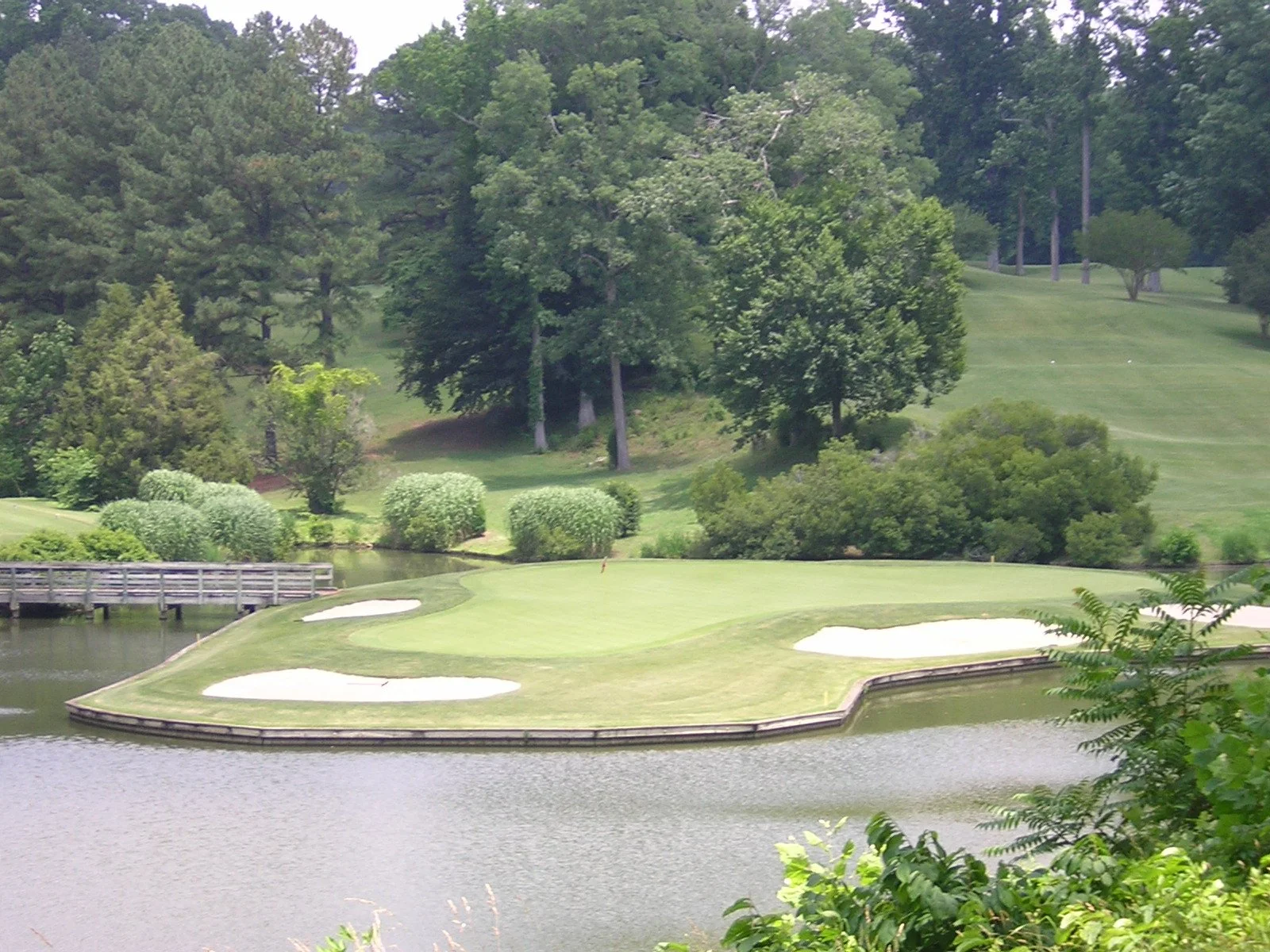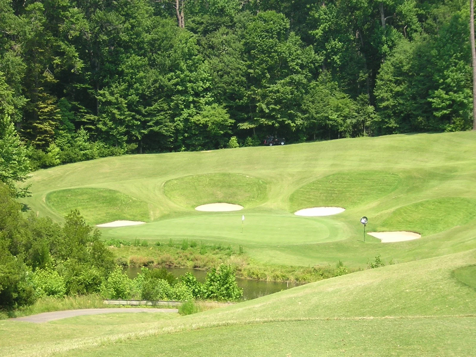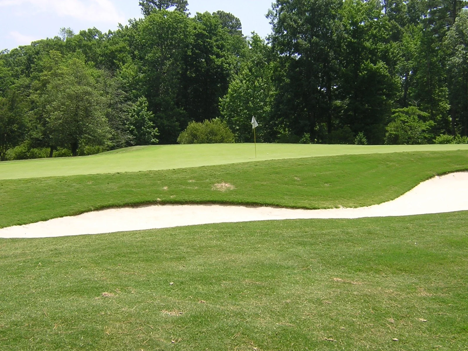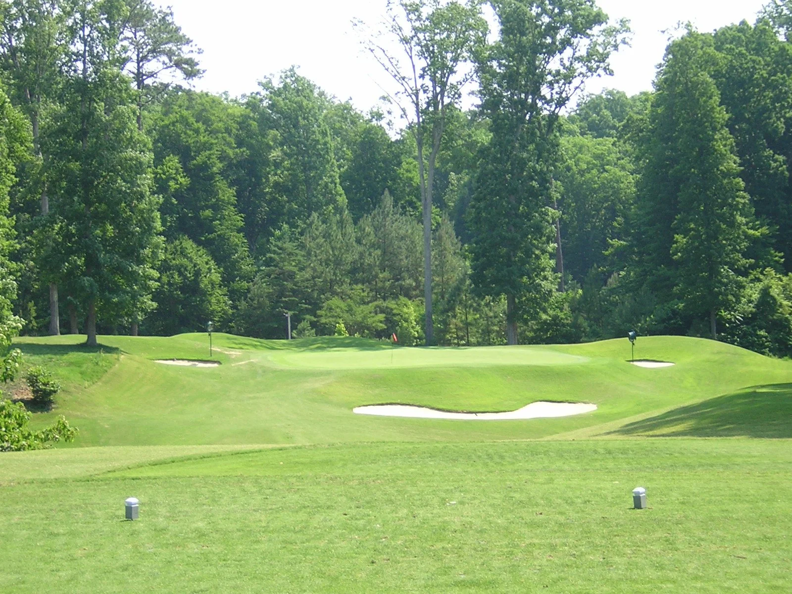 Yet another signature hole on the Green Course, the 18th is a straight-shooting, uphill par five that leads to the clubhouse. From an elevated start, your tee shot must carry 200 yards over water to reach the fairway. I will say that the landing area is generous, with mounding on either side, just in case. A big drive down the fairway can clear the plateau and leave a possible chance at getting home in two. Just ask Camilo Villegas, who, during the NCAA Eastern Regional, reached the green with a mid-iron after blasting his tee ball over 300 yards. Most normal folks will lay up, as the fairway narrows as you approach the green. The elevated putting surface is guarded by a series of traps that sit well below the hole. The green itself is as slick as any on the course, and it runs from back to front. A great finishing hole.