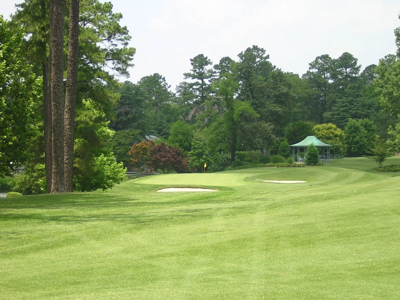 The final hole typifies the Gold Course at Golden Horseshoe. A long, dogleg-left, tree-lined par four. The fairway is long and narrow and requires a deep blast down the right side, as any shot left will be partially blocked by the tall trees. A medium to long iron will remain to a slightly downhill placed green that slopes from back to front. The putting surface is guarded in front by a pair of traps, while left of the target will end up wet. A very demanding finishing hole, especially with the match on the line.