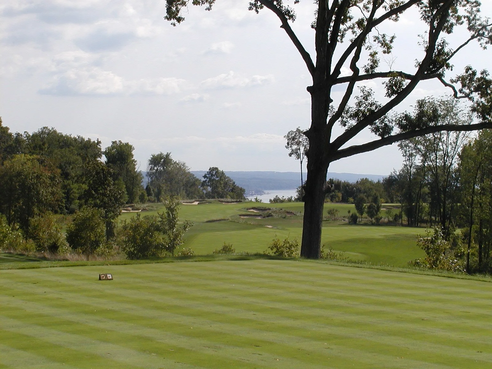 The back box on the fifth shares the tee with part of the practice range, which gives the player his first view of the Hudson River, which stands behind the player. This dogleg right par four plays downhill off the tee, but not on the second shot, as the lay of the land would suggest. The green is
