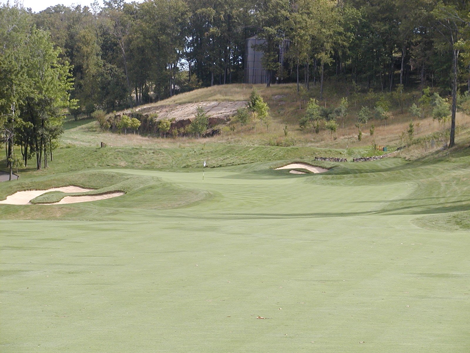 white, the player's view of the right side of the green is slightly blocked out by the hillside.