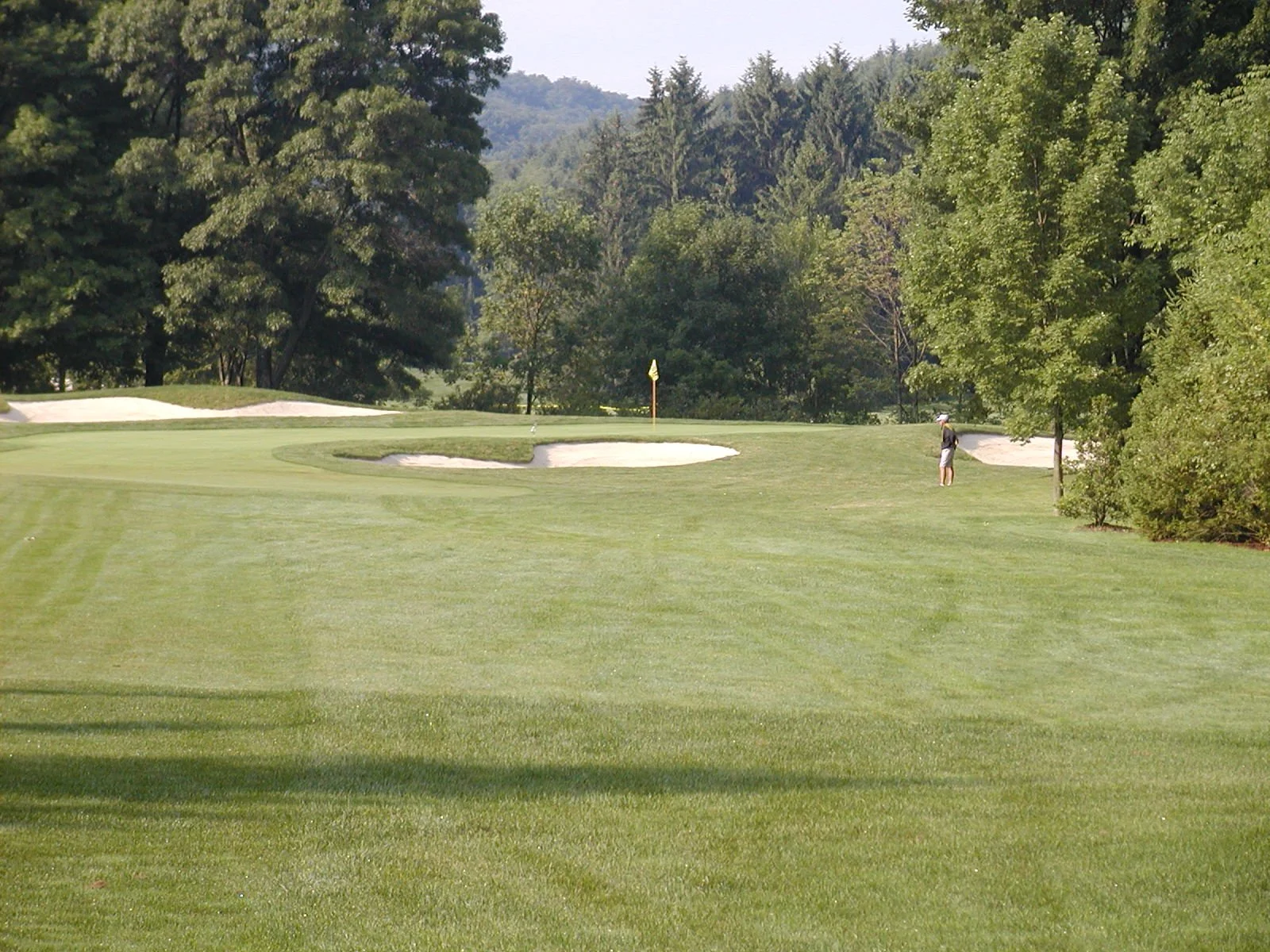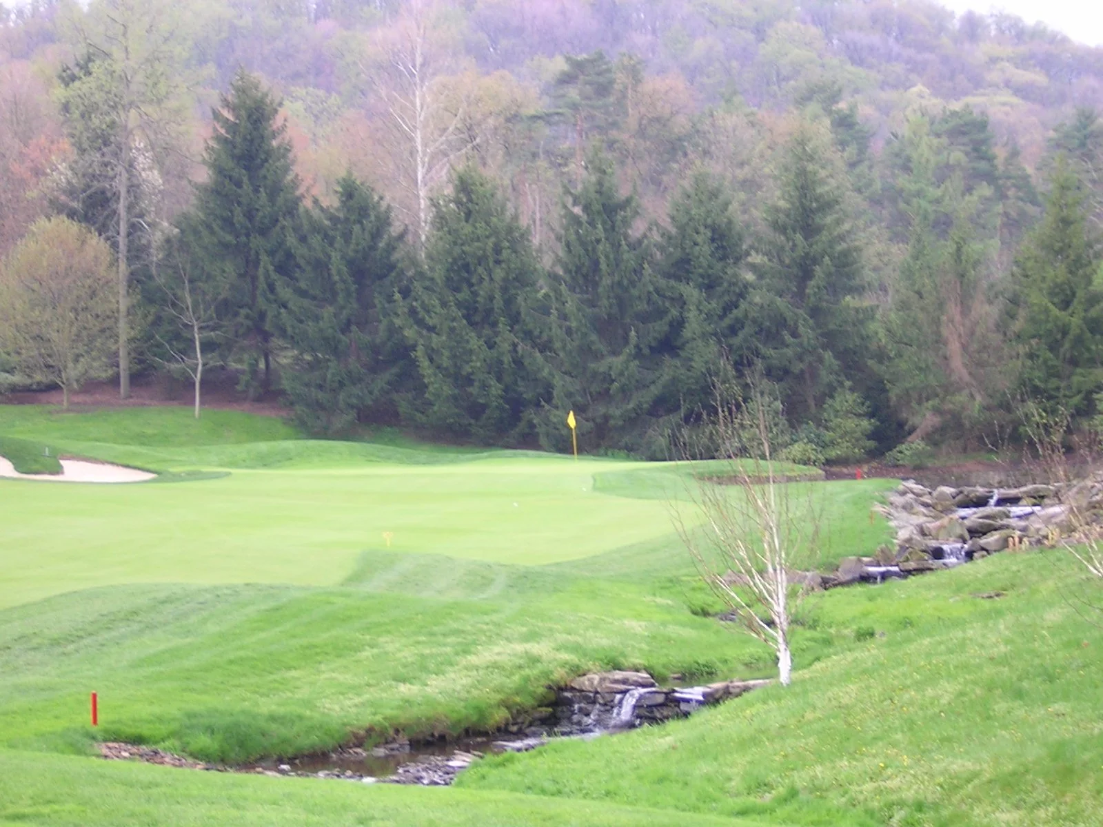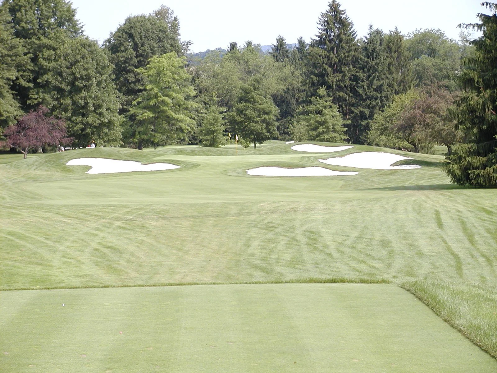 hole was a dogleg right and has been altered to be a dogleg left, with a new fairway carved to the north. Your tee shot must favor the right side, as most shots will move to the left due to the fairway slope. From here, the player has a couple of options. One, go for the green in two or layup at the 140-150 yard mark. First off, going for the green is quite risky, as the second shot plays severely downhill and features a bunker 44 yards short of the green in the center of the fairway, so run-up shot is eliminated. A medium-iron to layup would be appropriate, to avoid the severe downhill lie if you try to get greedy. The putting surface is quite long and is quite receptive to a short-iron that will set up a birdie. From the top of the hill looking down towards the green, the player is afforded the luxury of the scenic surroundings of Ligonier Valley and Laurel Highlands.