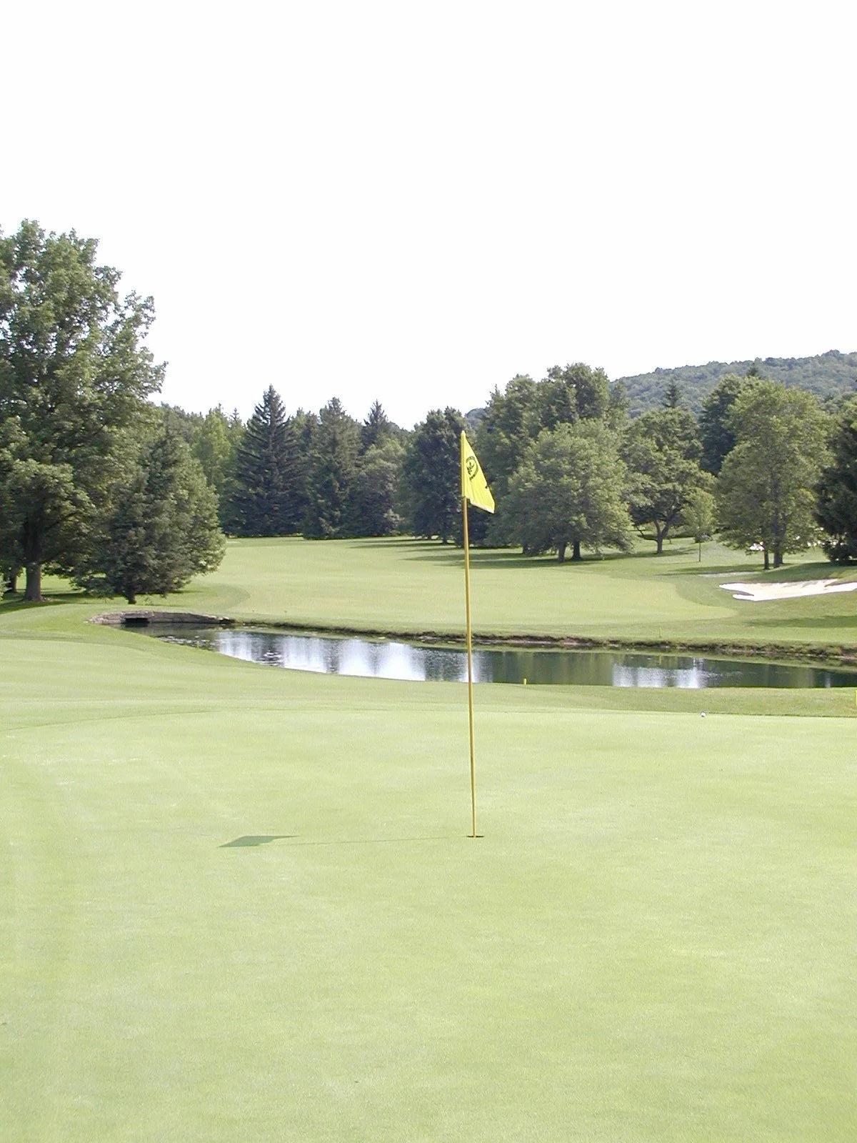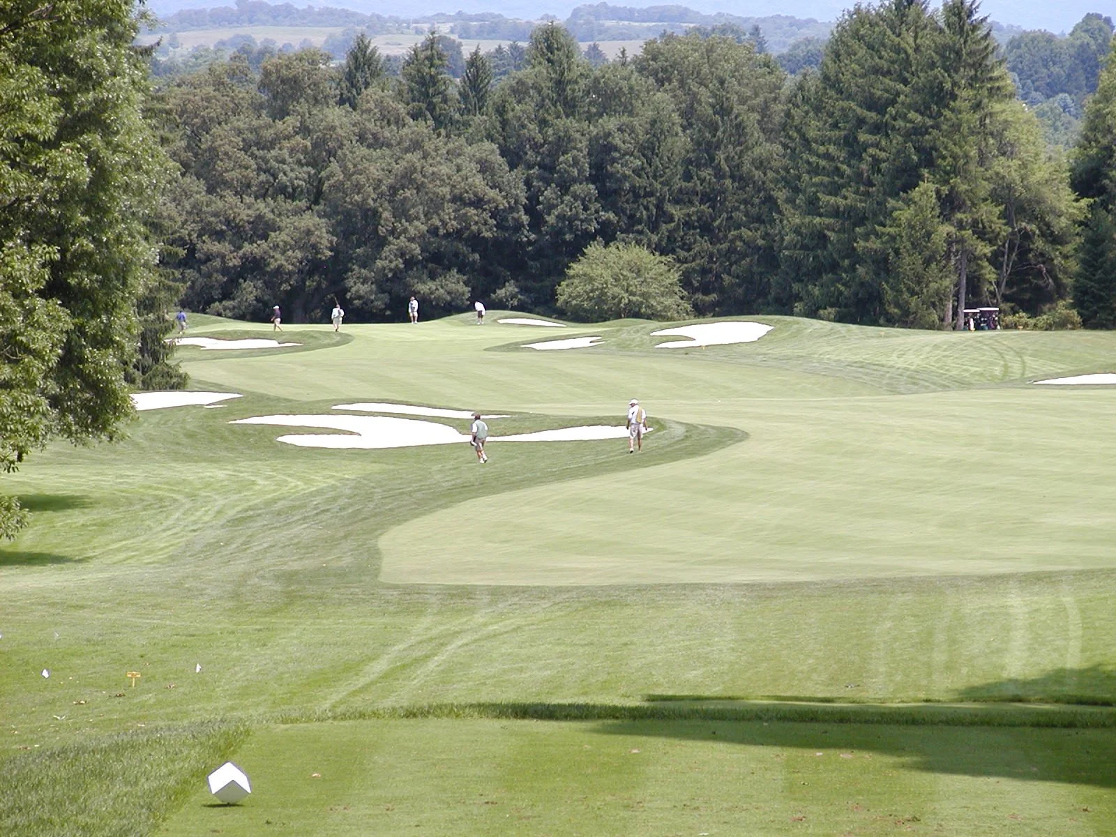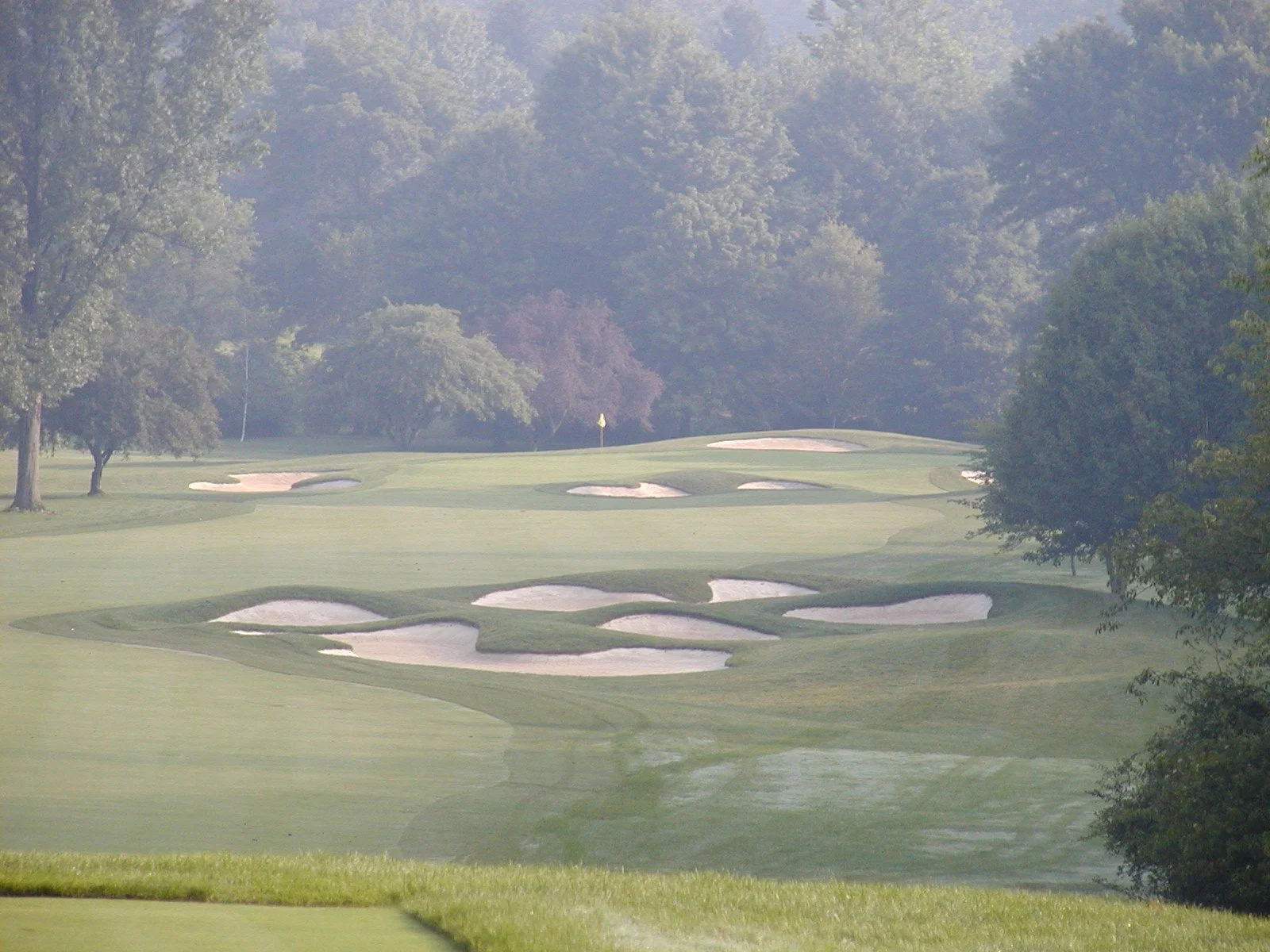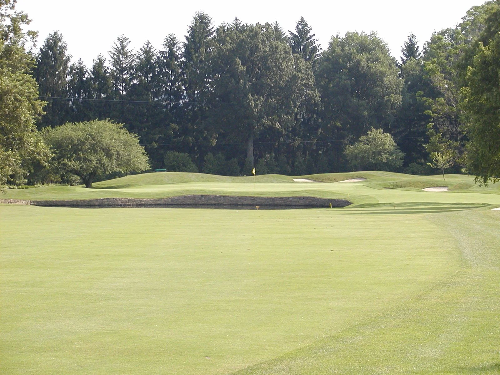 hole was a dogleg right and has been altered to be a dogleg left, with a new fairway carved to the north. Your tee shot must favor the right side, as most shots will move to the left due to the fairway slope. From here, the player has a couple of options. One, go for the green in two or layup at the 140-150 yard mark. First off, going for the green is quite risky, as the second shot plays severely downhill and features a bunker 44 yards short of the green in the center of the fairway, so run-up shot is eliminated. A medium-iron to layup would be appropriate, to avoid the severe downhill lie if you try to get greedy. The putting surface is quite long and is quite receptive to a short-iron that will set up a birdie. From the top of the hill looking down towards the green, the player is afforded the luxury of the scenic surroundings of Ligonier Valley and Laurel Highlands.