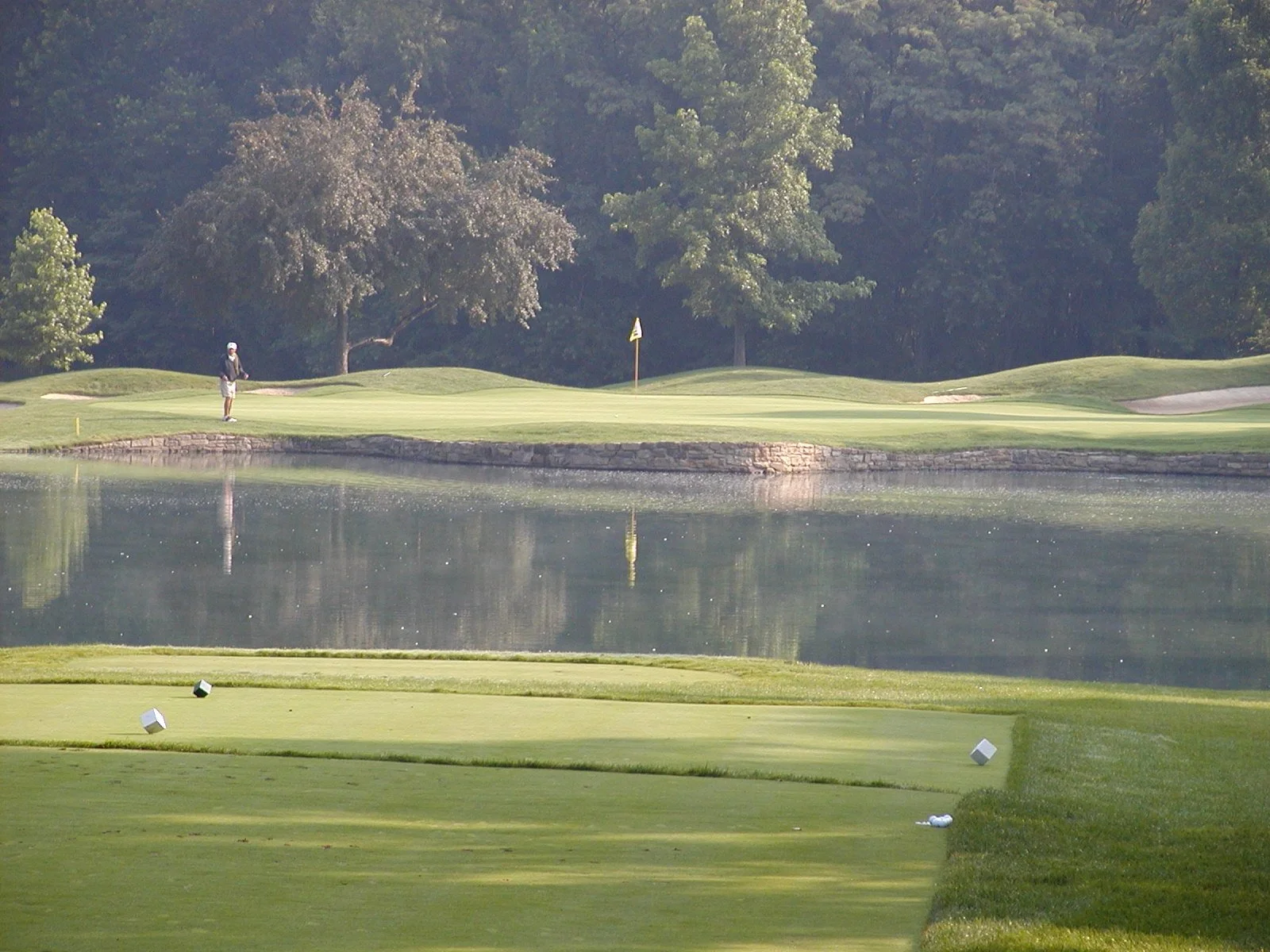 One of the most difficult driving holes on the course, the 15th is only 375 yards, but requires the utmost of accuracy. A lake guards the left side of the dogleg and two bunkers and trees protect the right. A long-iron or fairway-metal must hit the right side of the fairway to leave an unobstructed view of the green. The putting surface is the narrowest on the course, but is quite long at 35 yards in depth. The green funnels toward the center and slopes to the front, so be below the hole for a solid chance at birdie.