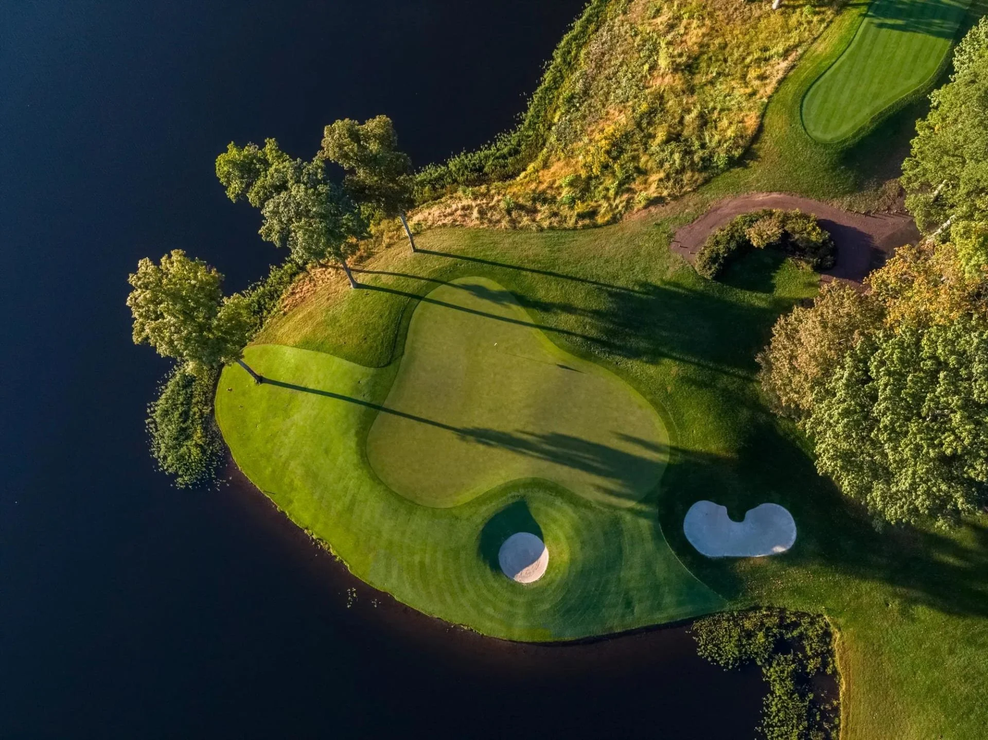 The fourth is the first three-par on the course. This huge greens makes club selection a key ingredient, as the surface offers several possible pin placements. A pond and three bunkers guard the green, while the lake extends to green side on the left.
