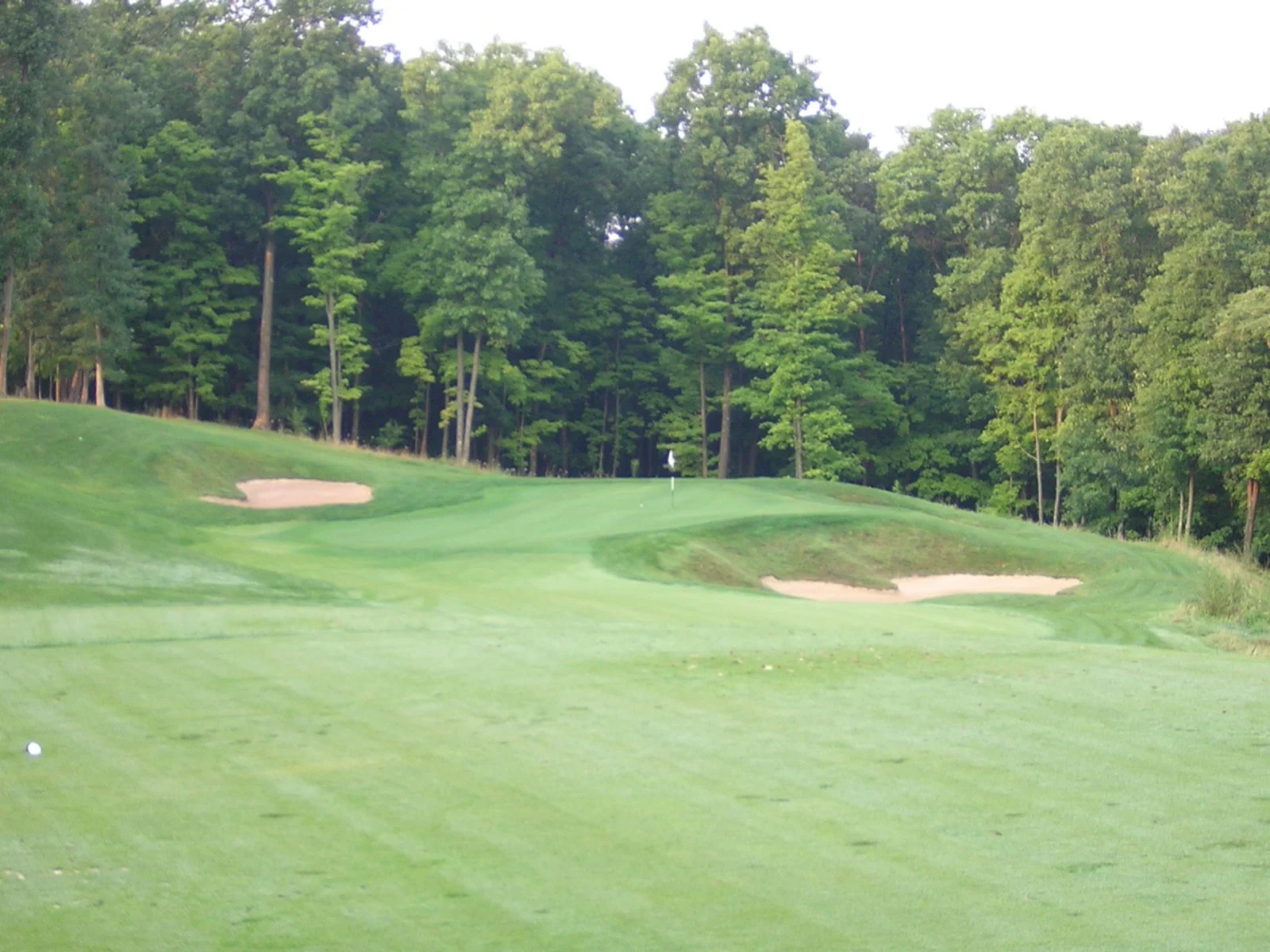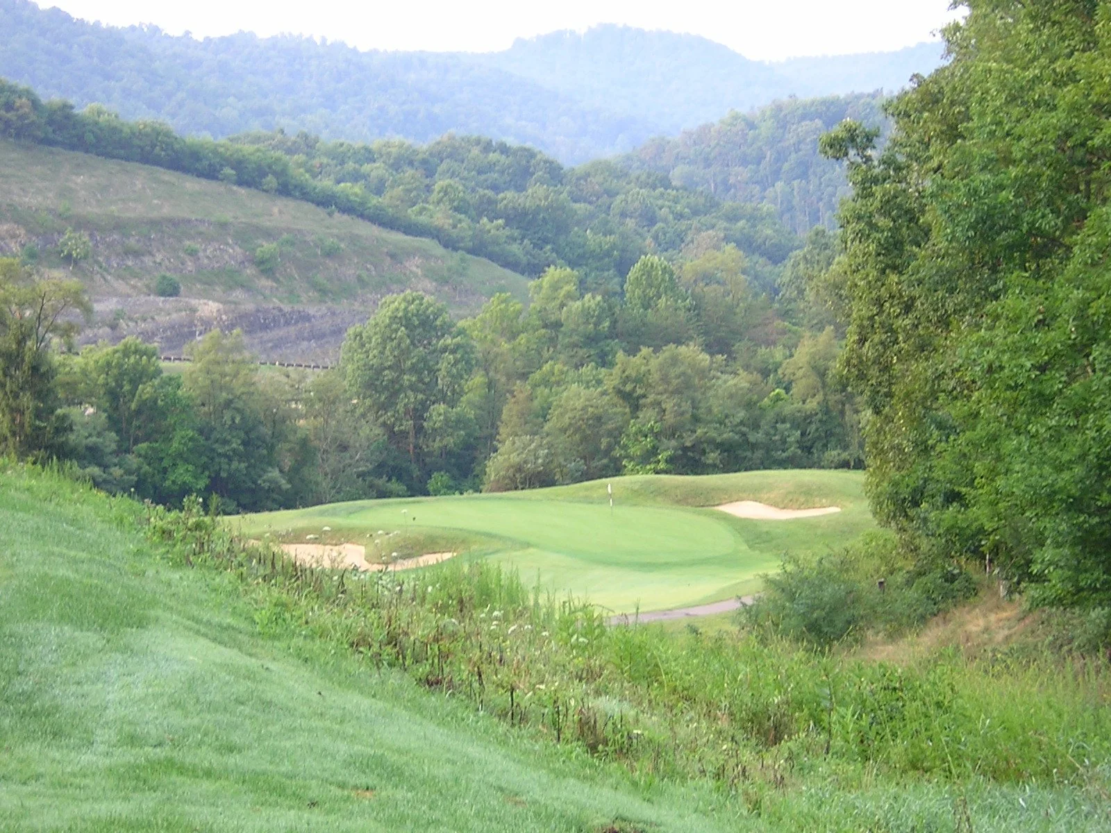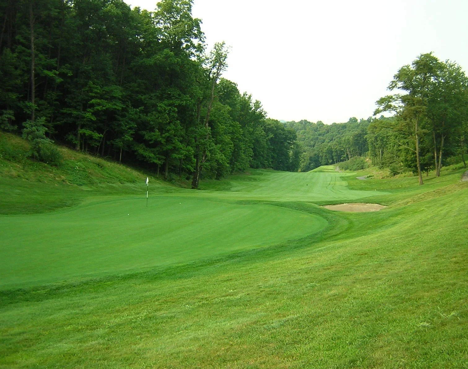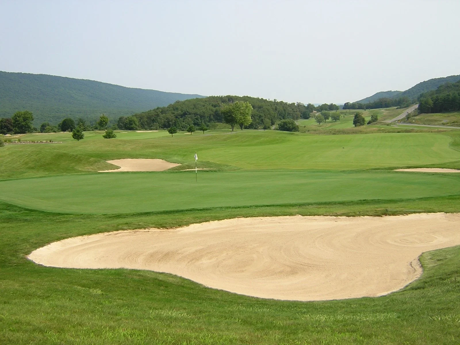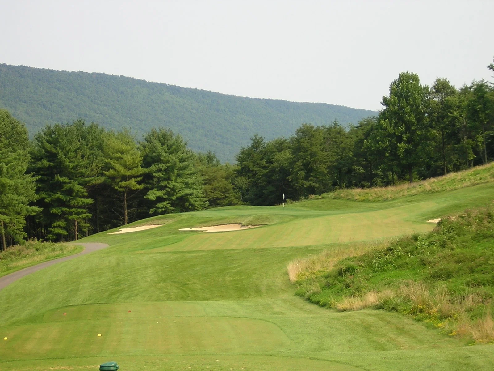 By far, the most spectacular hole at Rocky Gap, the fifth, is not only electrifying, it's also terrifying. This awesome par five plays downhill from tee to green. A pair of fairway bunkers lie in wait in the center of the enormously-wide landing area. Tall trees stand watch on both sides of the hole, as it narrows towards the green. It's worth the risk off the tee of trying to explode a drive over the traps down the right. This can set up a reasonable chance of getting home in two. Trouble looms down the left in the form of thick rough and your layup shot, if that's your choice, will be to a narrow sliver of fairway guarded on the right by sand. Another deep greenside trap guards the putting surface that swings around to the right. A front flag can be had, but a back-right pin brings plenty into the mix. Don't get greedy.