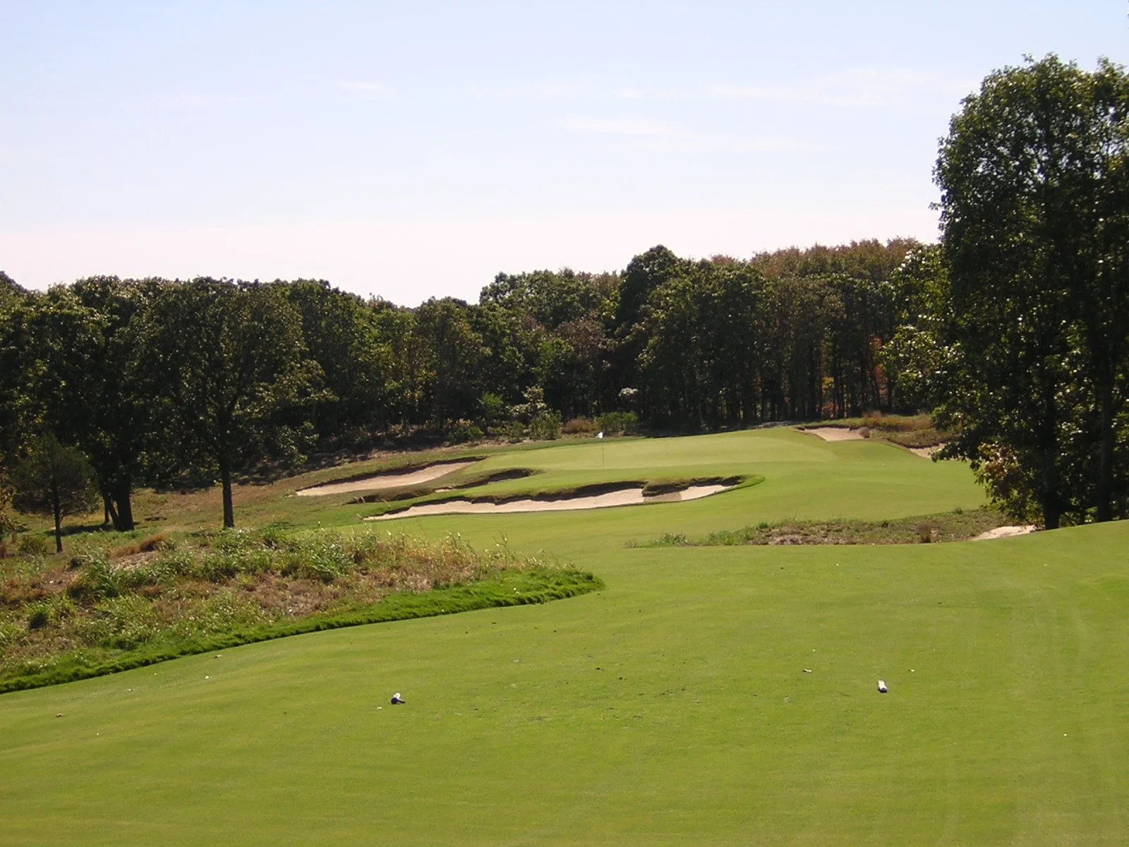 Playing back towards the clubhouse, the third is an uphill par four that requires a tee shot down the right side. The fairway slopes to the left, where three deep bunkers lay in wait. Your uphill approach will necessitate an extra stick or two depending upon pin placement. This green is another surface with a false front, so club selection is key. By the way, the gaping bunker to the left is a "Bear" of a trap.