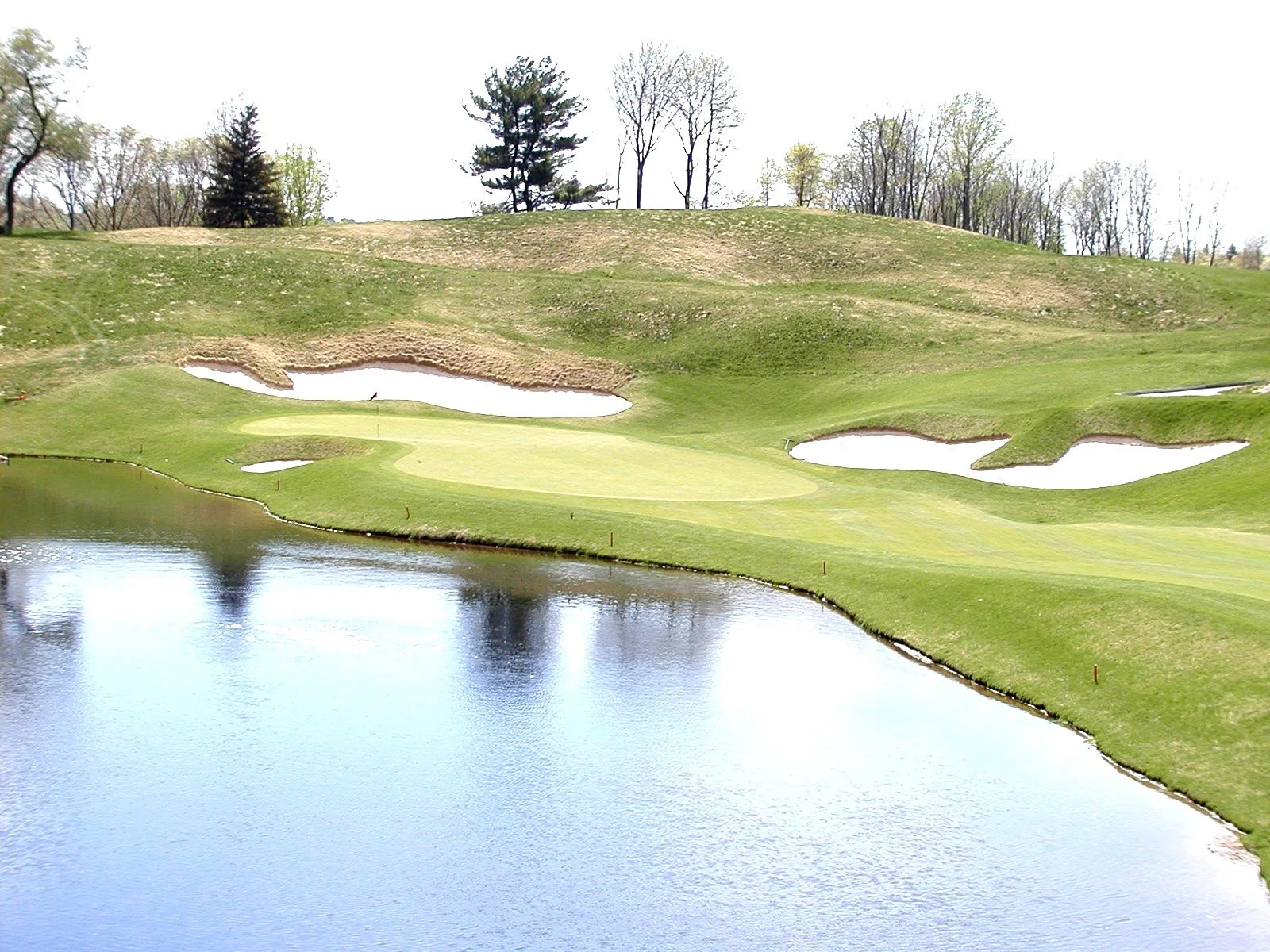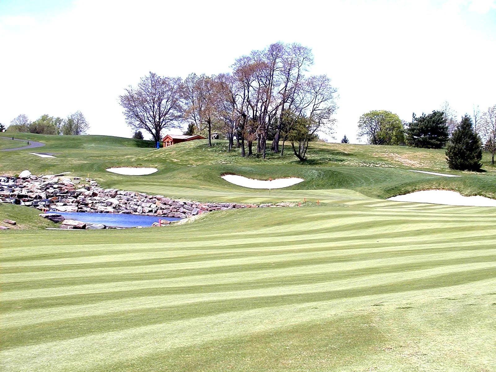 hole. From the back tees, getting home in two is really quite a stretch, so even with a big blast, you'll still want to layup to the 100-yard mark. A simple pitch to a large green is not as easy as it sounds, with water right and a deep bunker, short left. A back-right pin is for tournament play, so