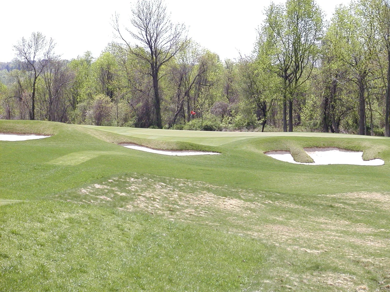area. The second shot is key, as the putting surface is 30 feet above the fairway, with two bunkers fronting the green and one deep. At least one extra club will be required to reach the surface, which is quite quick from back-to-front and right-to-left. Long, and you'll have a tough up and down, short and your shot will trickle down off the green.