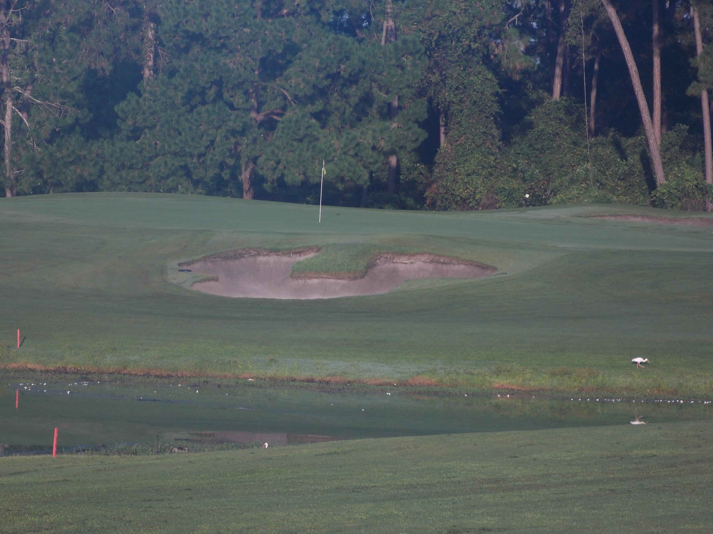 The 17th is a dogleg left around a huge body of water hugging the entire left side with another pond