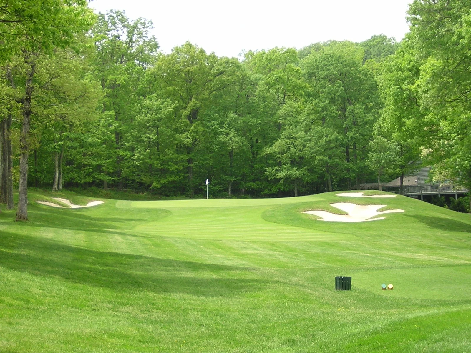 The closing hole on the outward nine is rated as the second-most difficult on the course. Now 485 yards in length, the ninth is a dogleg-right, uphill par-4. Not only must your tee shot find the fairway, but it must be long, as your second plays one or two clubs longer. Toss in a two-tiered, 30-yard-long putting surface and you'll be hard-pressed to make par. A back-left pin is next-to-impossible to make birdie, let alone get close to. Play for par and be happy.