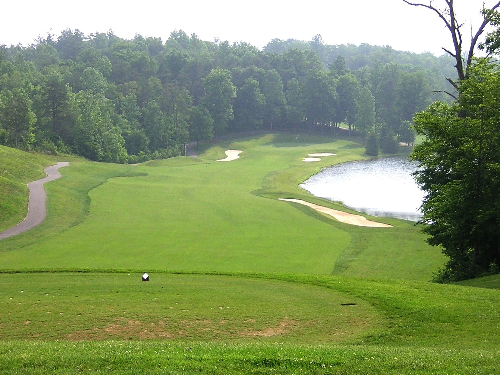 At the highest point on the golf course, the 14th features a panoramic view from behind the tee of the Blue Ridge Mountains. You'd be remiss if you didn't take the time to wander back and gaze at this natural beauty. OK, back to work. This dogleg-left par-4 requires another accurate tee ball. Thick trees guard the left and rock outcroppings cover the right at the landing area. Just a short-iron should remain to a very tiny putting surface, only 22 paces deep. The slope of the green is minimal, but its narrowness makes it difficult to hit.