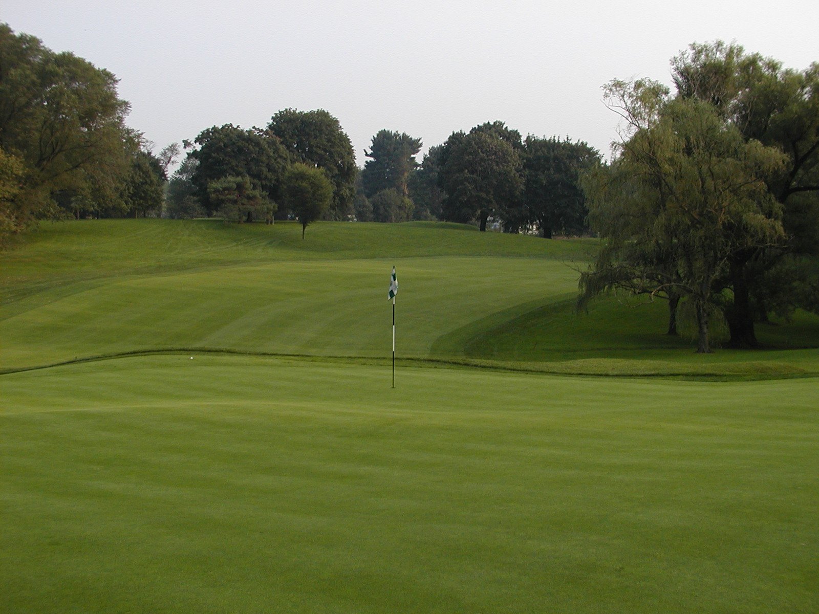 One of the most difficult holes on the front nine is the 431-yard third. Bending slightly to the right, the hole is tree-lined down both sides of the fairway. To make matters worse, from 170 yards out, the fairway slopes down 40 yards to the green while the putting surface rises six feet above the fairway. The green is very steep, sloping back to front, often resulting in three putts or balls rolling off the surface. The precise play is three-metal off the tee followed by a medium iron. Greedy will result in bogey or worse, especially if you land left or right of the green in sand.
